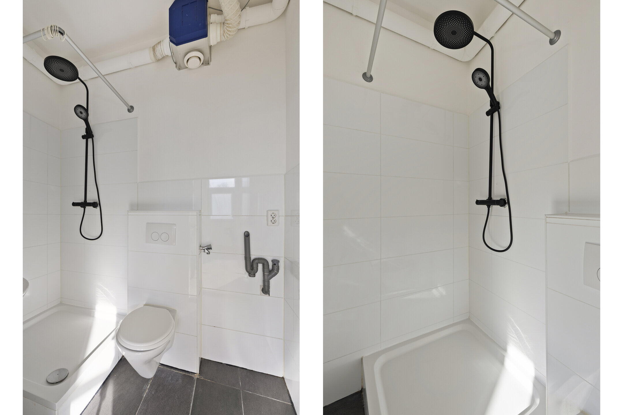 De badkamer (ca. 2.46 x 1.58 m) beschikt over een douche, een hangend toilet met inbouwreservoir, een wastafel en mechanische ventilatie. De ruimte is afgewerkt met een moderne donkere vloertegel en een lichte wandtegel en is voorzien van aansluitpunten voor een wasmachine en droger.