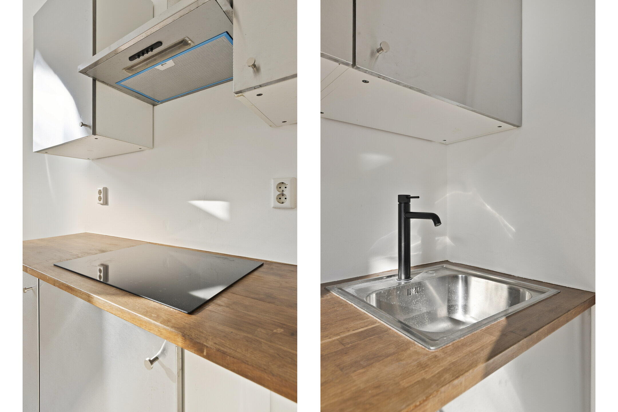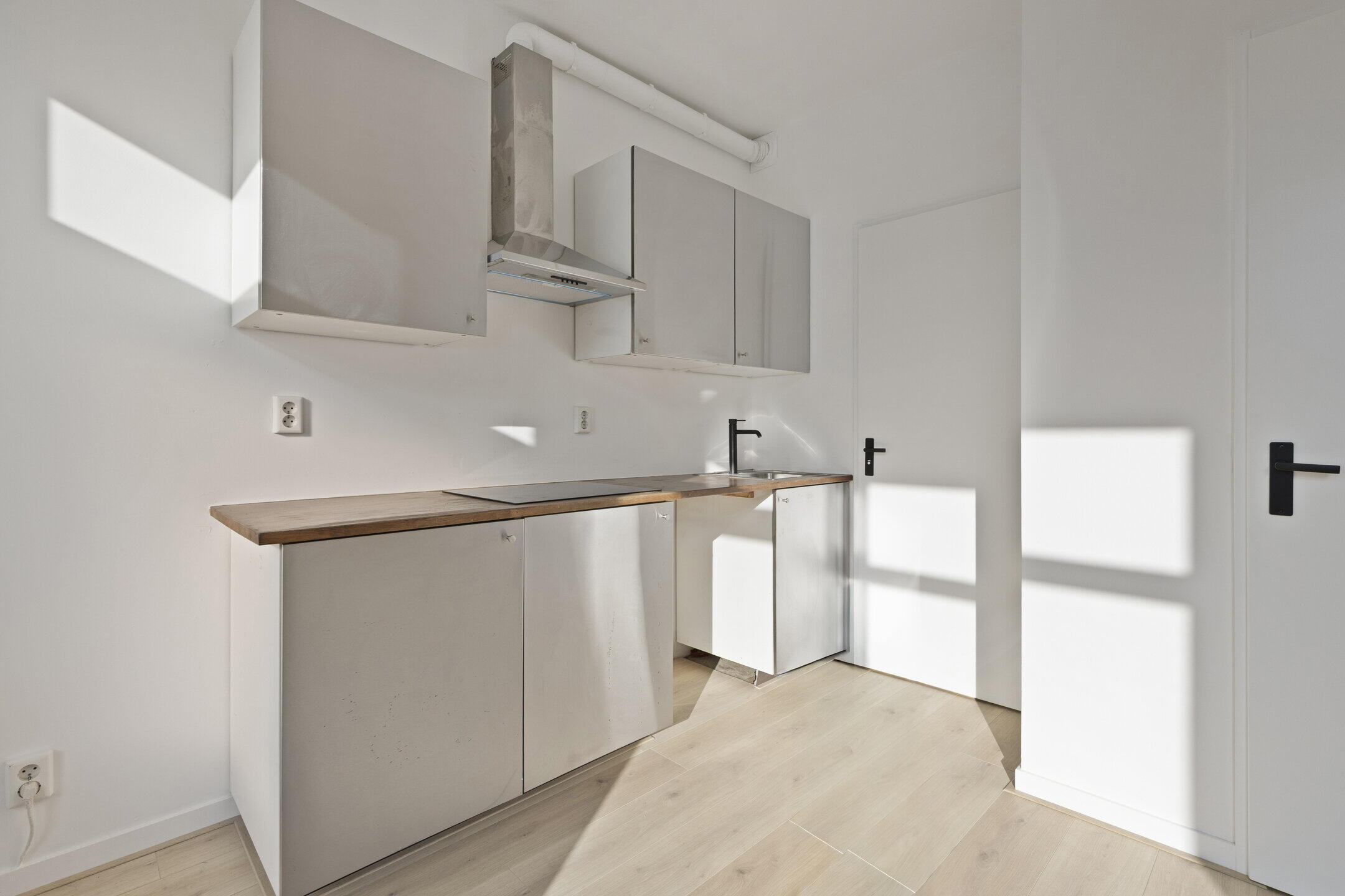 De open keuken, geplaatst in wandopstelling, is voorzien van een 4-pits inductiekookplaat, rvs afzuigkap, spoelbak en diverse boven- en onderkasten.